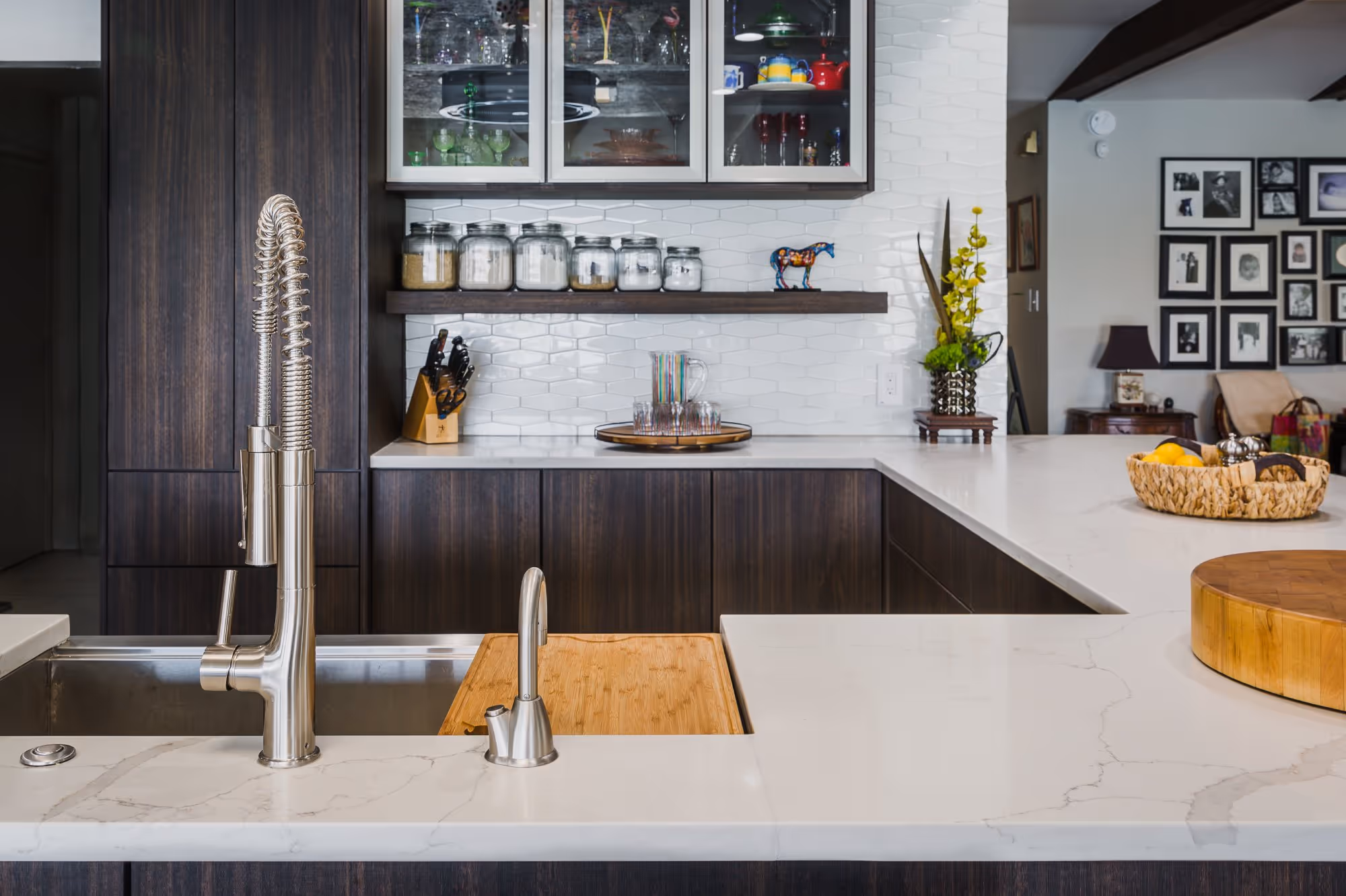 Now they have ample counter space to prep meals and can fit more than one pan on the cooktop at a time, making everyday chores so much easier. Adding a second sink in the bathroom means the husband is no longer relegated to the guest bath and they can start their day together.