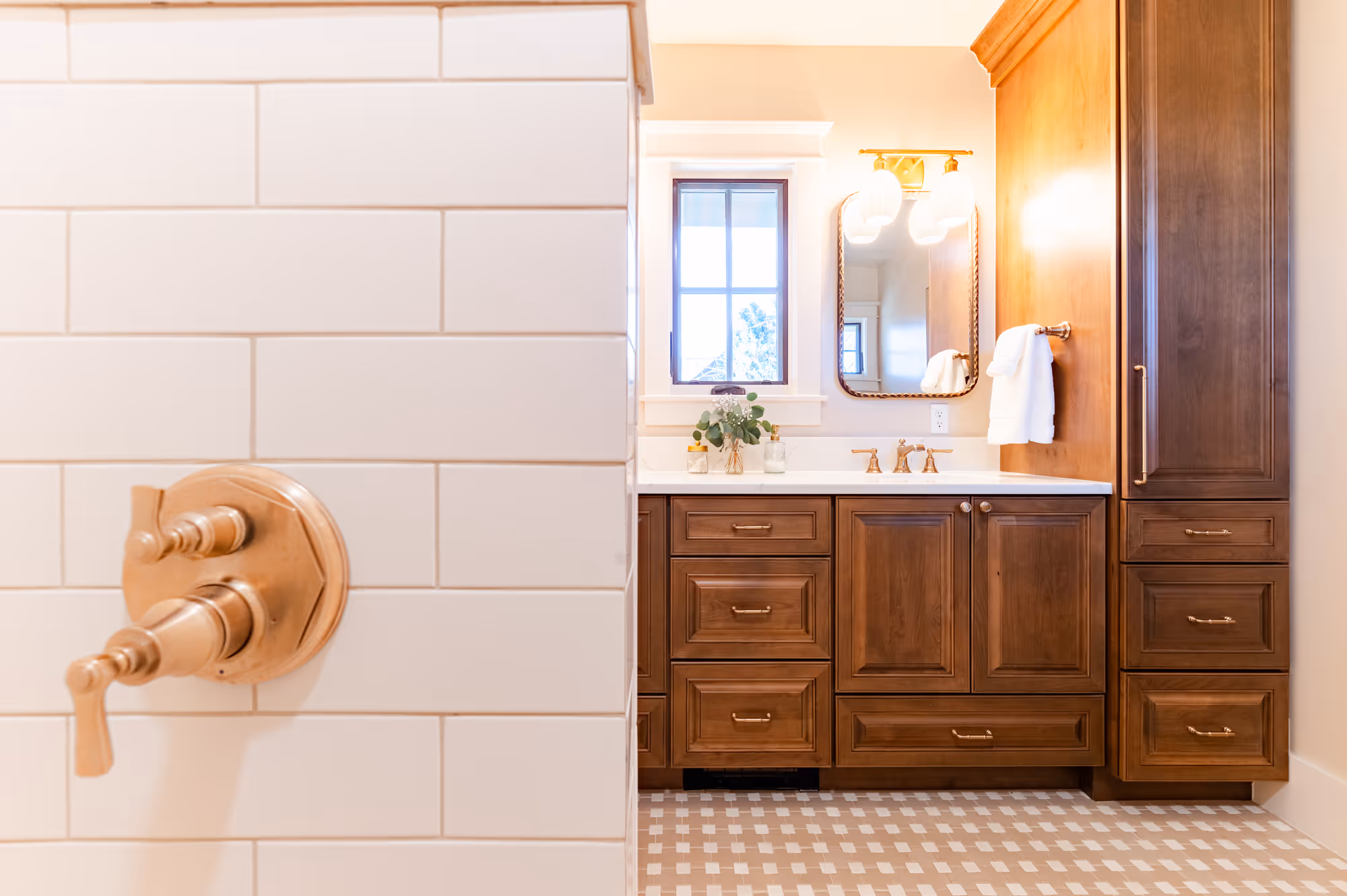 Primary bathroom – the existing primary bath was an addition to the home that never fit the home’s aesthetic. The shower was enclosed with floor to ceiling walls. In addition to being very dark, it made the rest of the bathroom feel extremely small. We cut one wall down and topped it with glass and added a glass “window” to the other wall that aligned with the window over the toilet to allow natural light to flow into the shower. White, laminate vanities and linen cabinets were replaced with warm wood toned, raised paneled doors that reflect the era of the home. The same floor tile as the hall bath was repeated here in a neutral, light brown and a custom decorative tile provides a decorative element in the shower. A new niche in the shower keep clutter off the shower bench and a new hand shower makes cleaning so much easier.