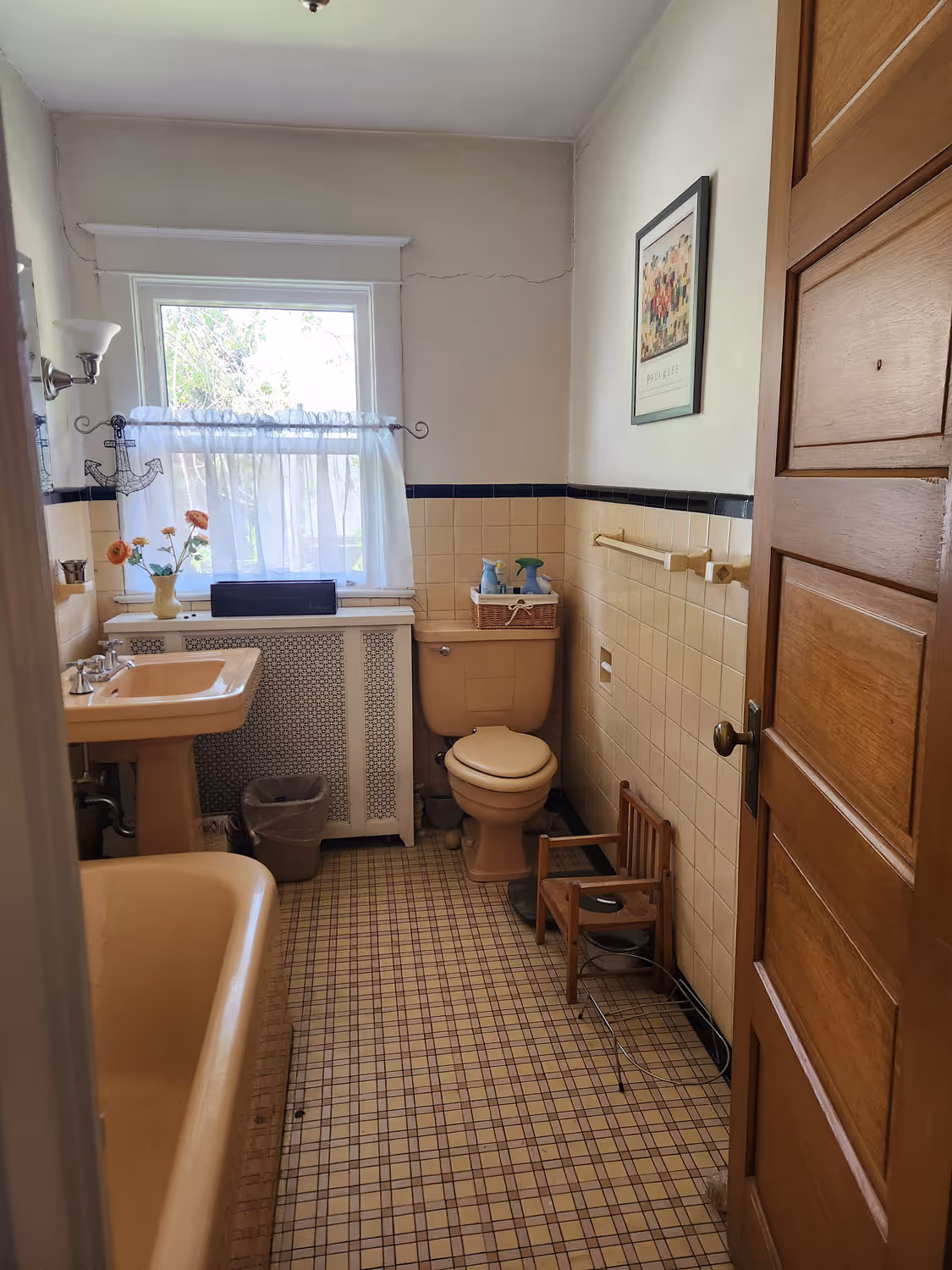 Secondary hall bathroom (NKBA PEAK 2024 WINNER) – the layout, fixtures, and finishes were original to the home. A radiator under the window and a bathtub at the entry made for an uncomfortable and awkward layout. The wife longed for storage and a free-standing tub under the window that was appropriate to the era of the home. To meet her desire, every fixture in the bathroom needed to be relocated. With the new 3-drawer vanity located by the door, the tub under the window, and the toilet between them, the room now makes more sense and feels more spacious. Ceramic, mosaic floor tile consistent with the home’s era was the starting point for the new fixture and finish selections. Beautiful floral wallpaper, a decorative tile bar crowning the wall tile, and a new roman shade on the window finish out this award winning bathroom.