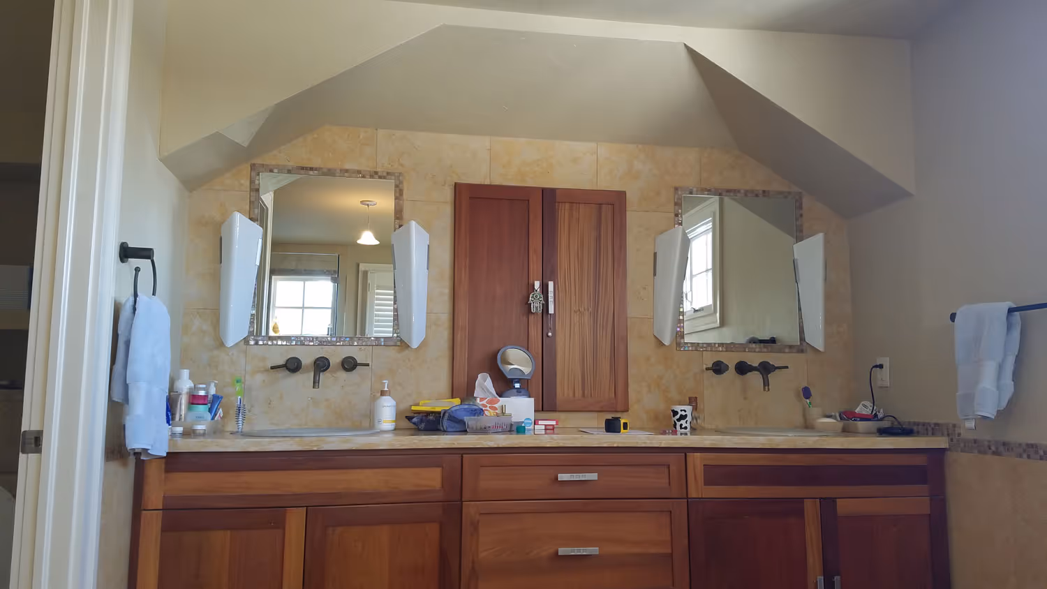 Living with dull, muted yellow marble surfaces in their bathroom for over a decade, these clients were desperate for a bathroom makeover. Their giant tub deck needed to go but, the rest of the bathroom layout still worked for the couple. Our major challenge was helping this couple merge their tastes into something that fit them both. The husband is all about bold color and major statements while the wife prefers a softer, more muted décor.
